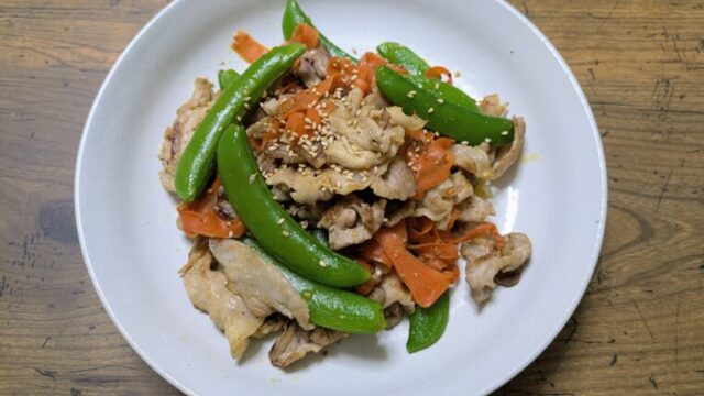 【包丁まな板いらず】豚こまとスナップエンドウのガーリック炒め