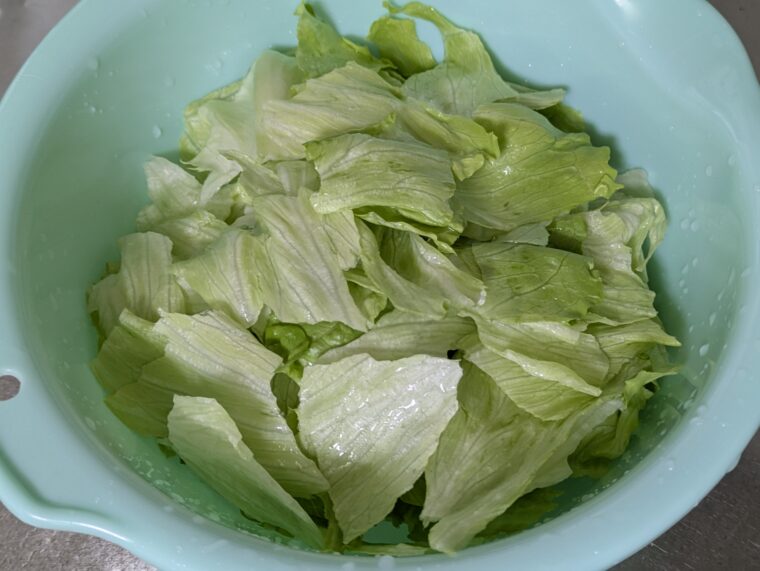 ①レタスは食べやすい大きさに手で千切ります。