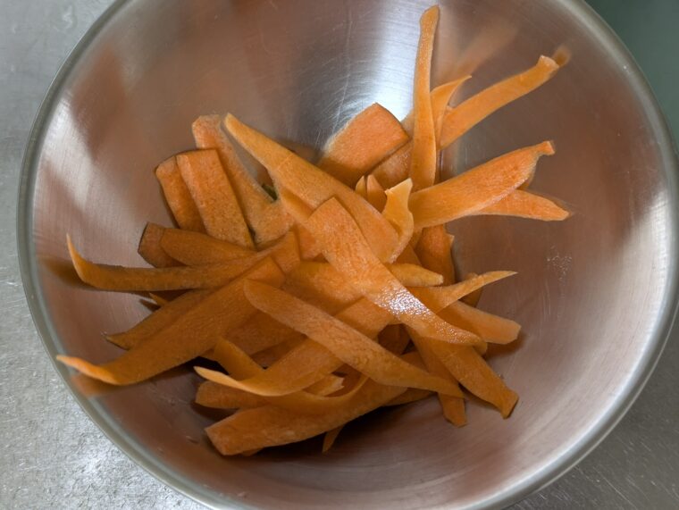 ②人参はピーラーで皮をむいてからそのままピーラーを使って薄くスライスします。