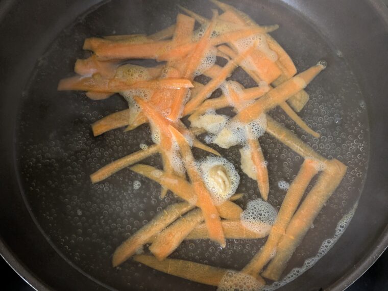 ③フライパンに水300ccと人参を入れて中火で加熱します。