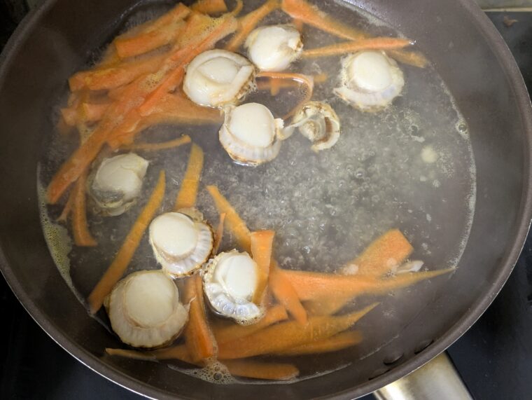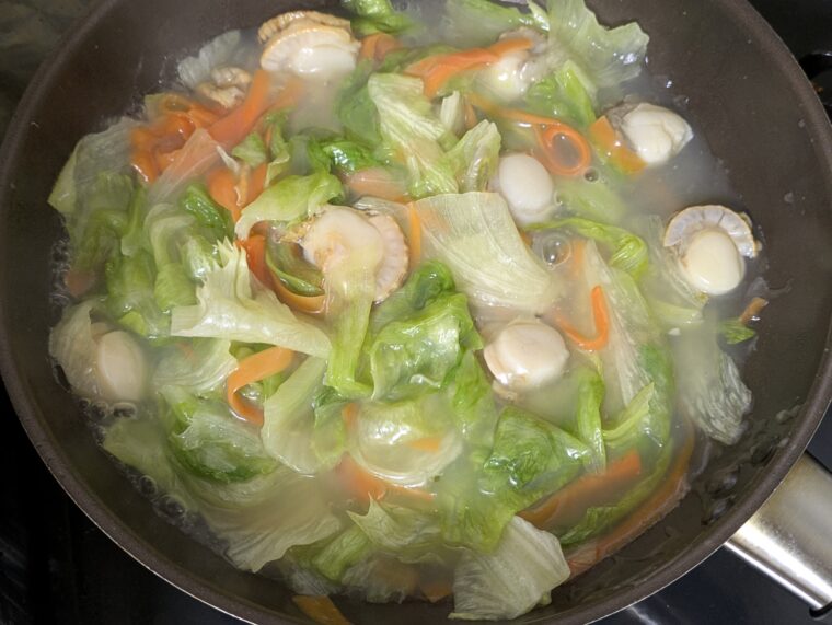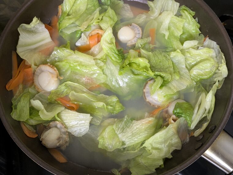 ⑤人参がしんなりしてきたらベビーホタテとレタスを入れて加熱します。