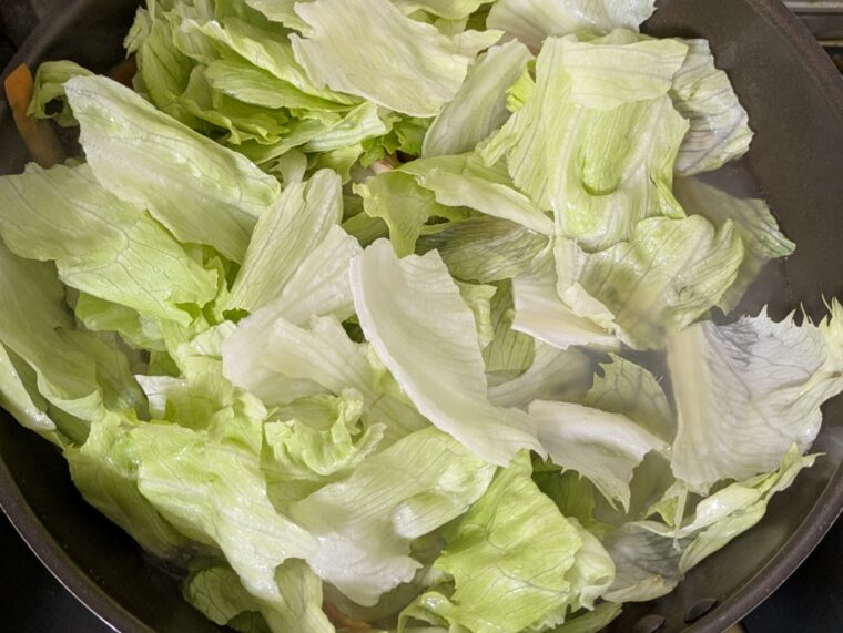 ⑦レタスがこのくらい少ししんなりしてきたら火を一旦止めて水溶き片栗粉を回し入れて混ぜてからもう一度加熱します。