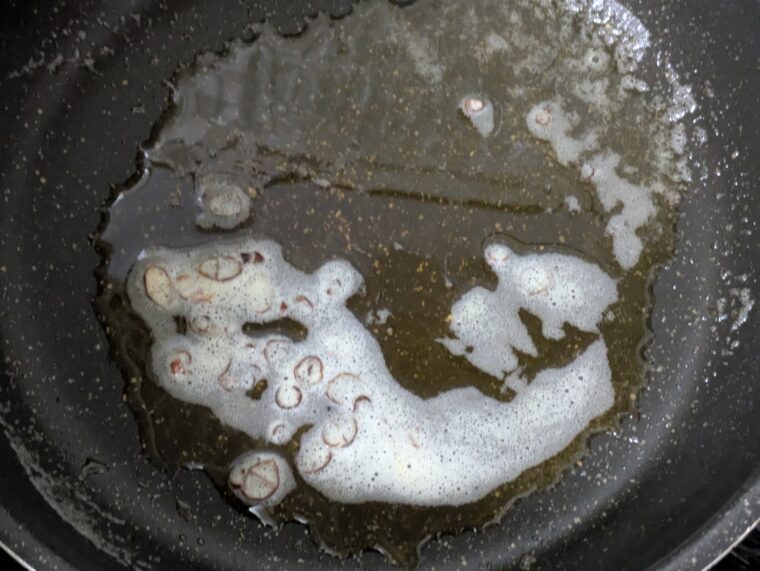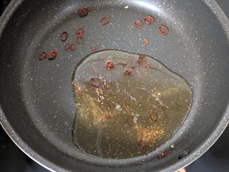 ⑦小さめのフライパンにごま油・輪切りにした唐辛子・花椒を入れて弱火で熱します。