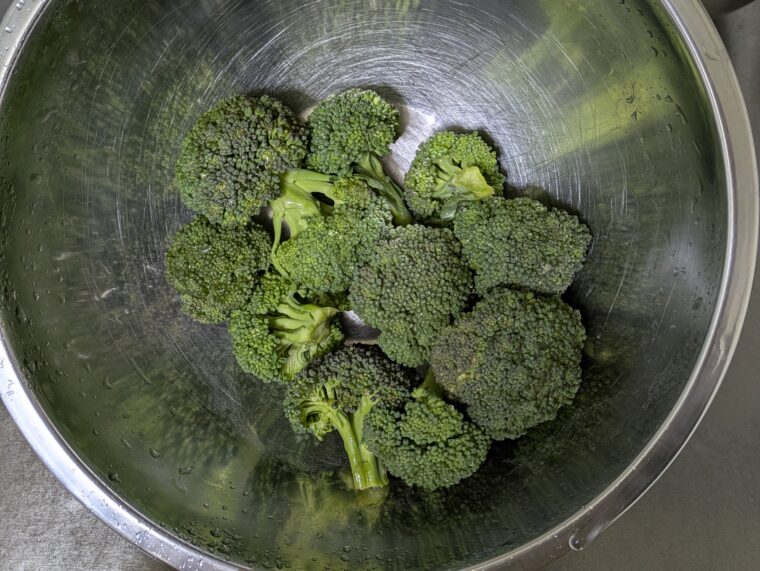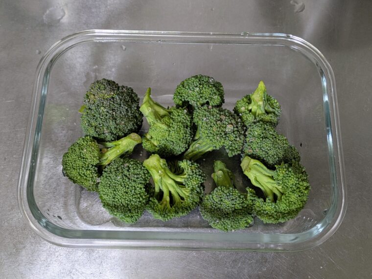 ④耐熱容器にブロッコリーが重ならないように入れて分量外で水を大さじ1と塩少々を加えてラップをして600w2分レンチンします。