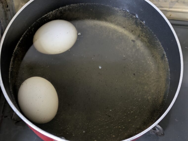 ⑦ひじきを茹でたお湯にそのまま卵を入れて8分茹でます。