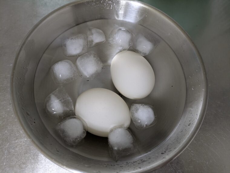 ⑧8分後冷水で冷ましてから殻を剥きます。