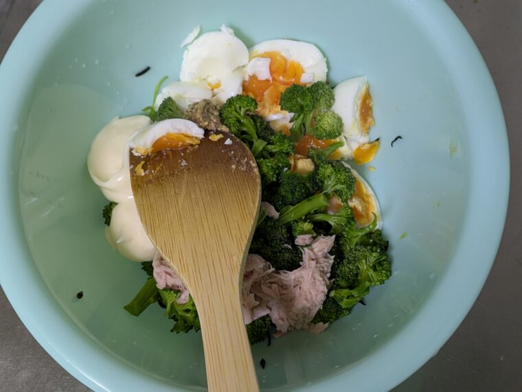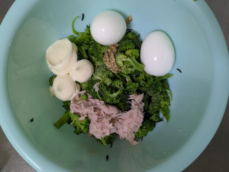 ⑨大きめのボウルにオイルを切ったツナと手で半分に千切ったブロッコリー・ひじき・ゆで卵とマスタードとマヨネーズを入れます。