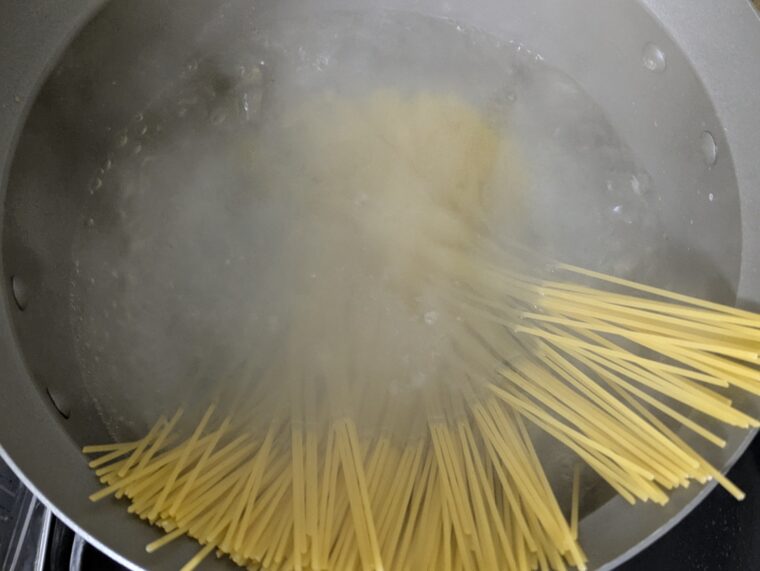 ⑤①のお湯が沸いたら分量外で塩を大さじ1を入れ溶かしてからパスタを入れ袋に書いてある既定の時間茹でます。
