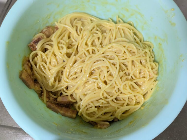⑧出来上がったカルボナーラソースにカリカリに焼いたベーコンと茹で上がったパスタを絡めます。