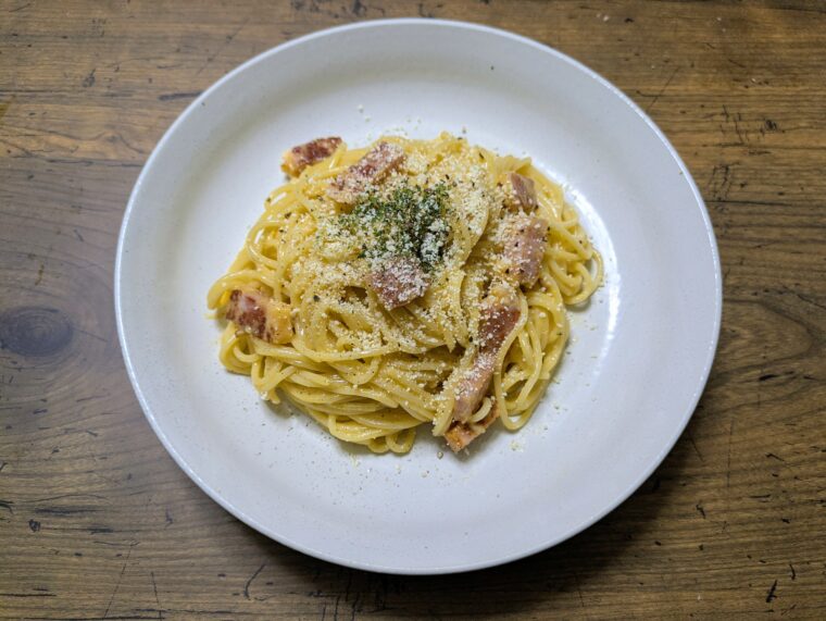 そこで今回は日本でも手に入るベーコンとパルメザンチーズで代用しご家庭でも作りやすいレシピを紹介しています。もちろん上記の材料が手に入る方はその材料を使う事で本場イタリアの味が完全再現可能です。