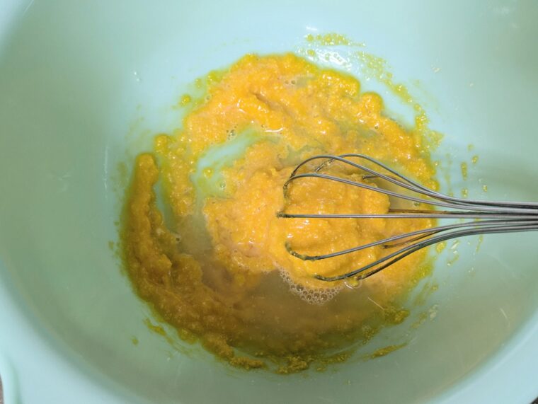 一度に茹で汁を入れてしまうと卵黄に火が入りすぎダマになるので少量(目安として大さじ1杯分)ずつ入れてその都度湯煎すると滑らかなソースになります。