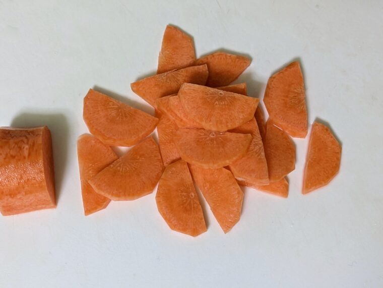 ③人参も同じように皮をむいて1㎜幅の半月切りにします。