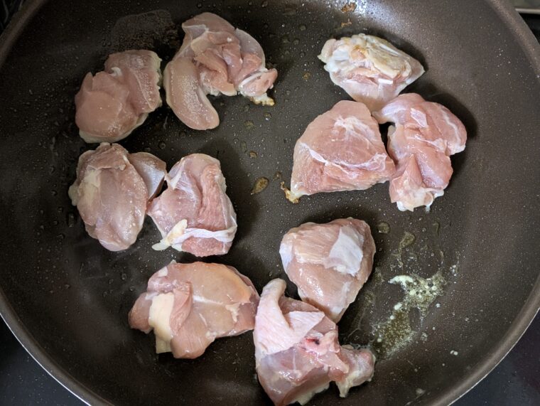 ⑤フライパンにバターを入れて中火で溶かしたら鶏もも肉を皮目から焼いていきます。