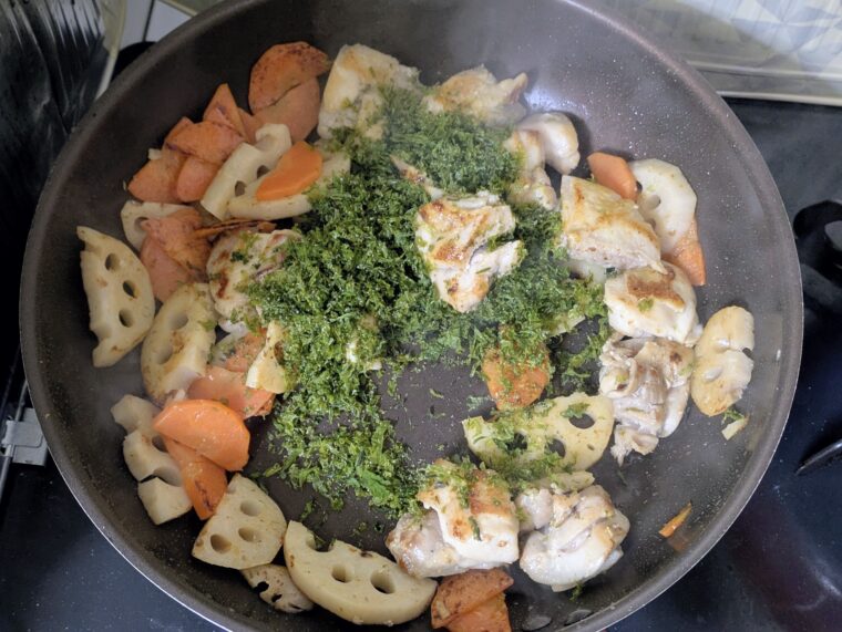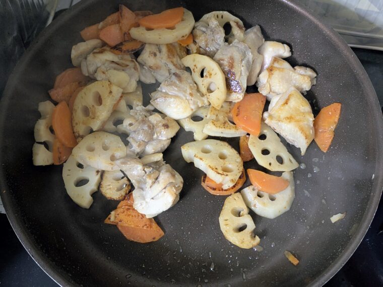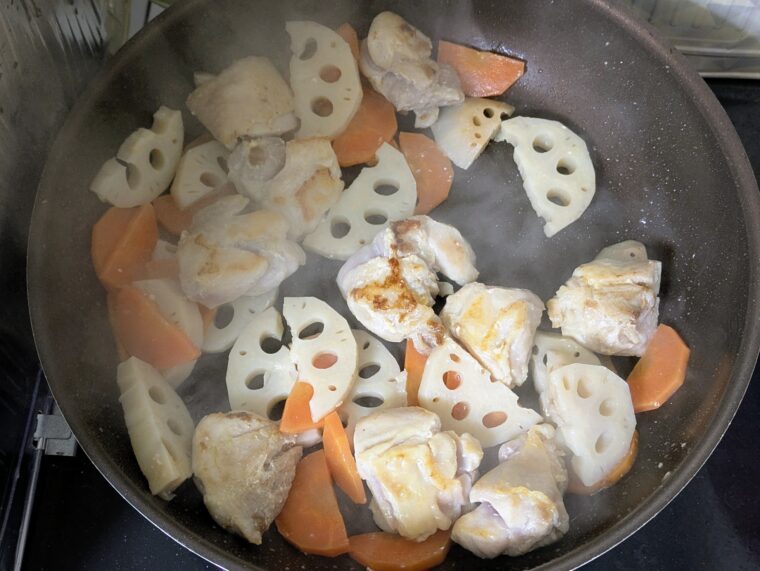 ⑦両面きつね色になったらレンチンした野菜と清酒とみりんを入れアルコールが飛ぶまで炒めます。
