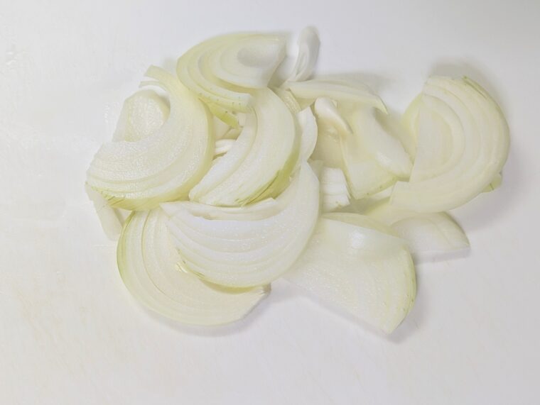 ②玉ねぎは芯を取り除いて3㎜幅にスライスします。