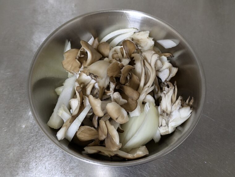 ③舞茸は食べやすい大きさに手で割きます。