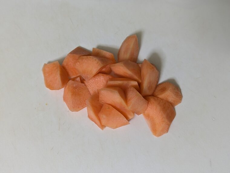 ①人参は皮をむいて乱切りにします。