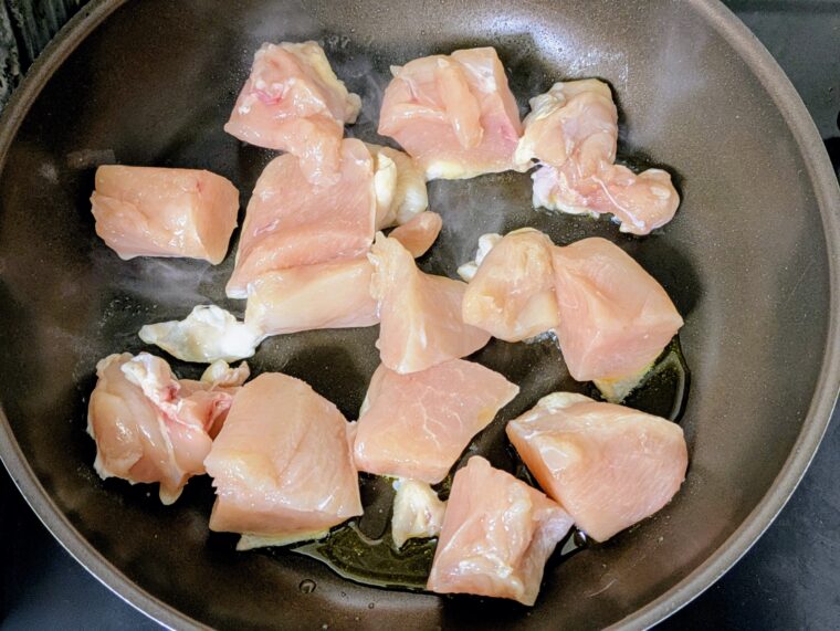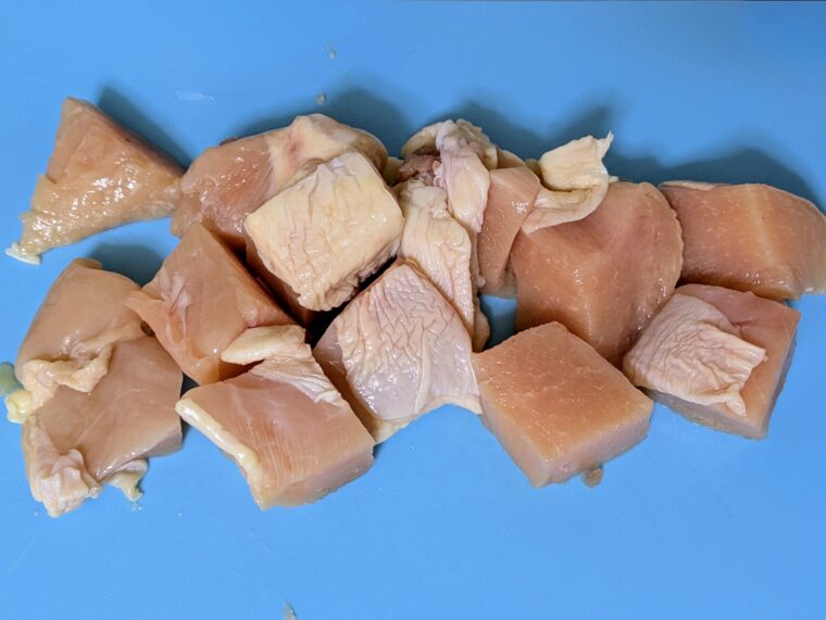 ④鶏肉は加熱すると縮むので一口大よりも少し大きめにカットします。