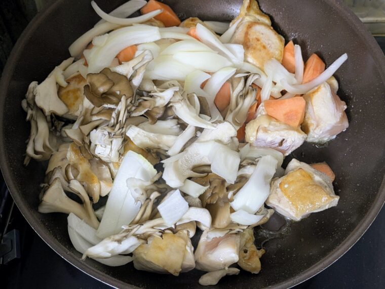 ⑧4~5分焼いて皮目がきつね色になったらひっくり返して☆の付いている材料とホールトマトを入れます。