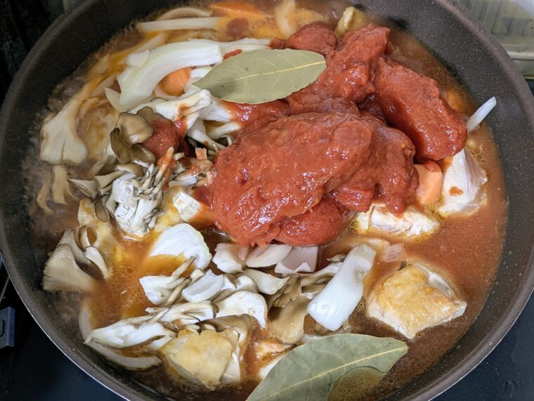 ⑩煮立ってきたら固形のトマトを潰してコンソメキューブを入れ約20分程煮込みます。
