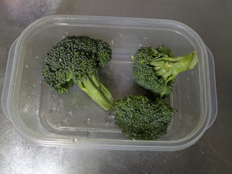 ⑭耐熱容器にブロッコリーを重ならないように入れて分量外で水小さじ2を入れてラップをして600w2分加熱します。