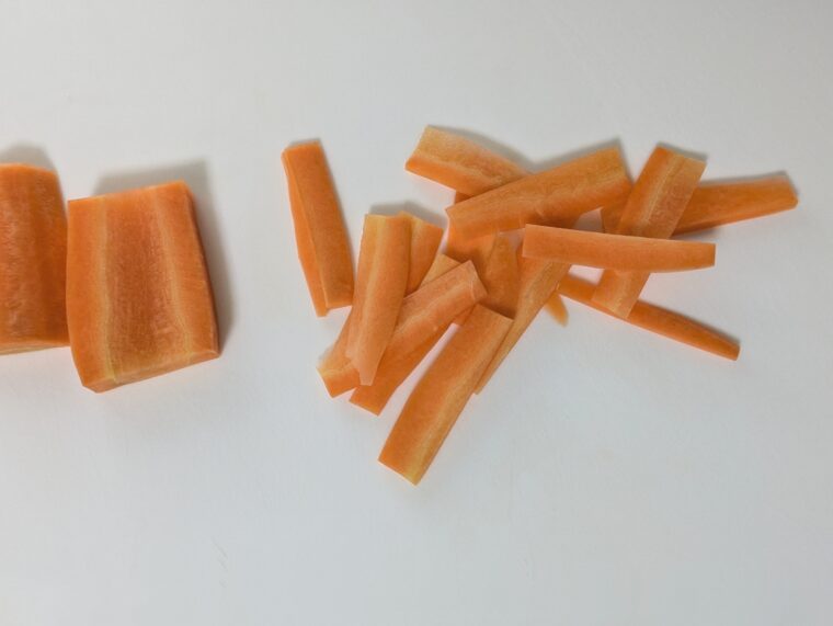 ②人参は皮をむいて縦3等分に切ってから短冊切りにします。