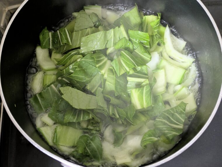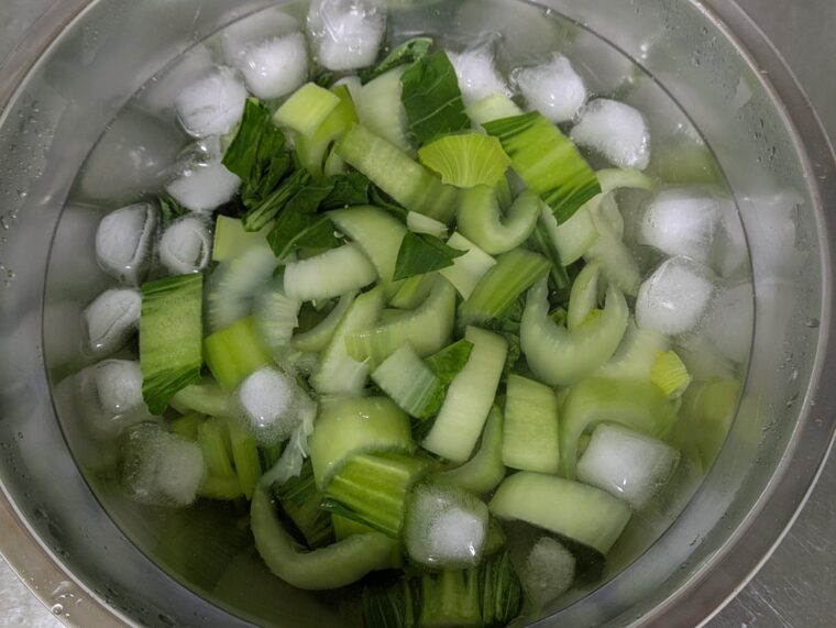 ⑦そのあと葉を入れて20秒加熱したらザルで湯切りをして氷水に浸けます。