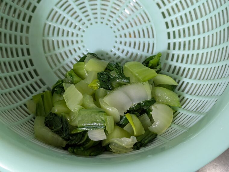 ⑧チンゲン菜が冷めたらザルで水切りをし軽く絞ります。