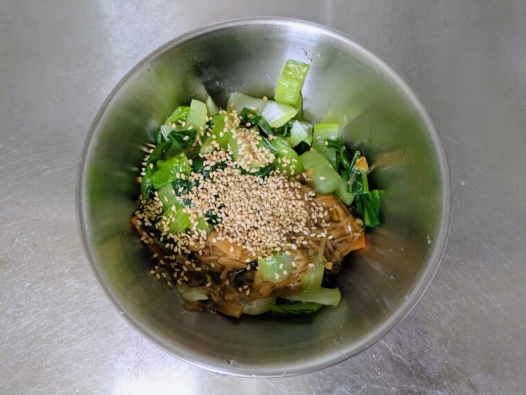 なめ茸の醤油ベースの味付けにチンゲン菜のシャキシャキ食感とごまの香りが食欲をそそります。