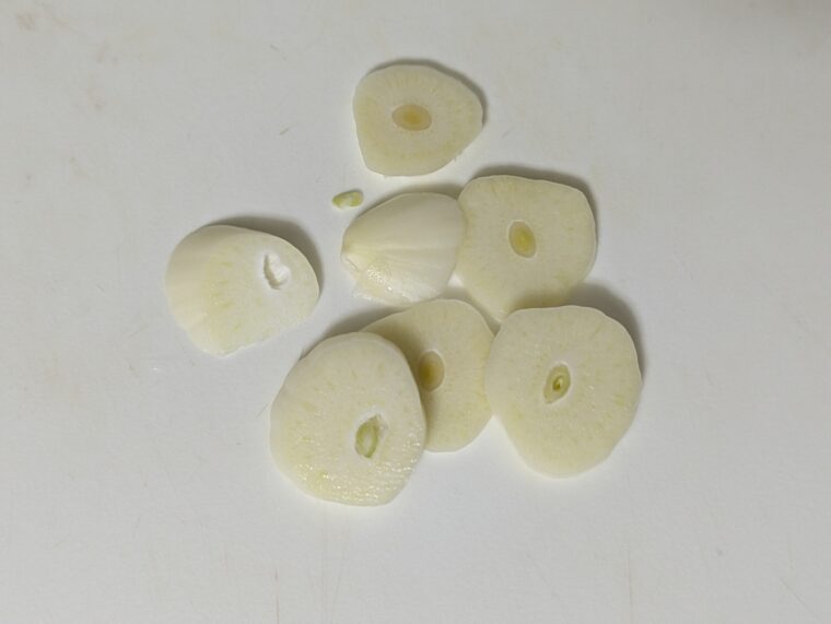 ②にんにくは皮をむいて横2㎜幅にスライスします。