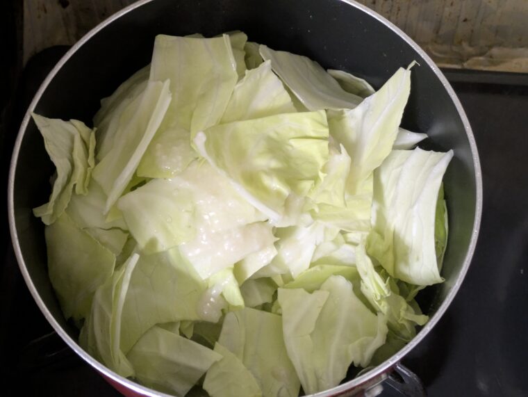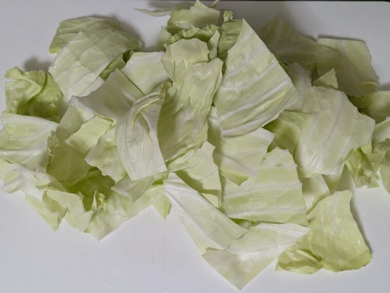 ①キャベツは固い芯を取り除き一口大よりも少し大きめに切ります。