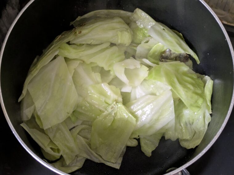 ⑤にんにくを取り出したら中火にしてキャベツを入れて1分炒めます。