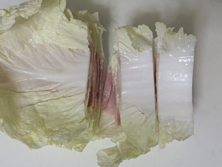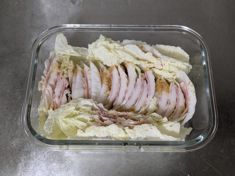 ①白菜はよく水気を切ってからベーコンと交互にミルフィーユ状に並べます。