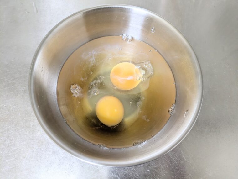 ④ボウルに卵を割り入れ水と白だしみりんを入れて白身を切るようによく混ぜます。