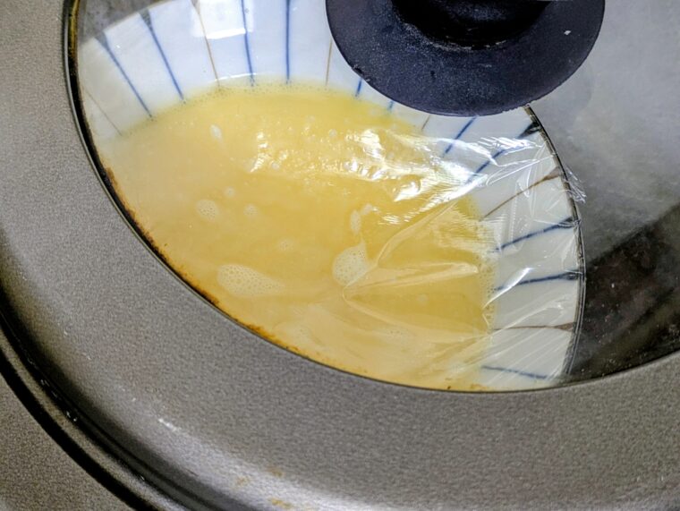 ⑪7分経ったら蓋を開けて様子を見ます揺らしてみて表面が固まっていたら取り出してラップを外します。まだならもう一度蓋をして追加で1分半加熱します。
