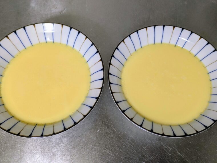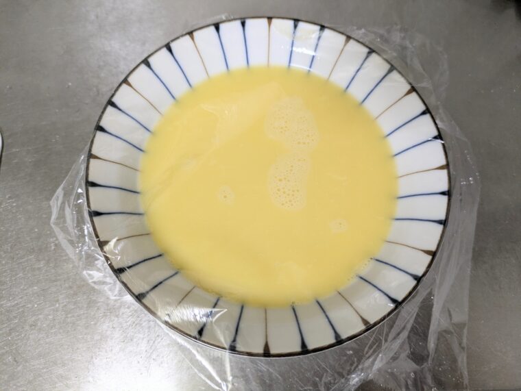 ⑤綺麗に混ざったらみそこし器で濾しながら少し深めの器に注ぎ入れたらラップをします。