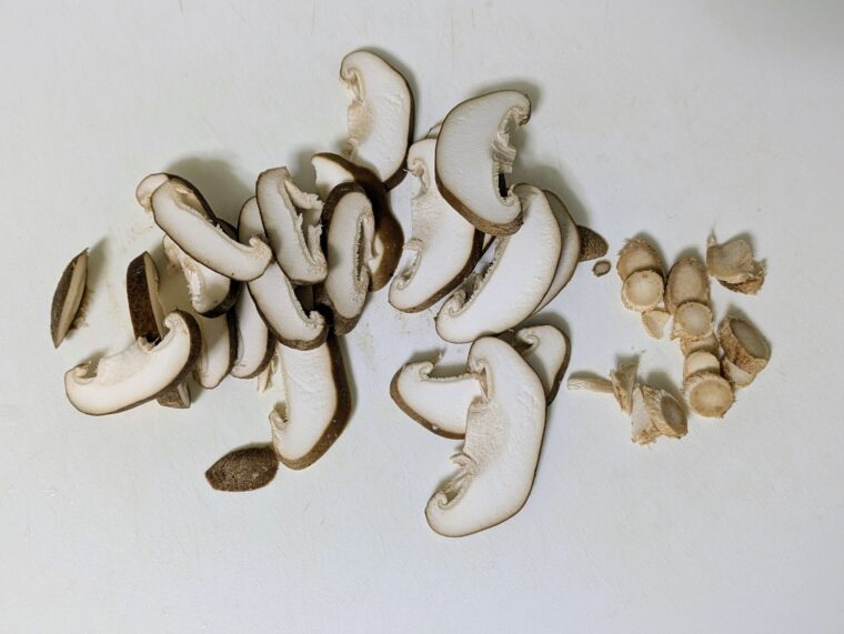 ①しいたけは石づきを切り落として茎と笠に分けて茎は小口切り笠は縦に薄く切ります。
