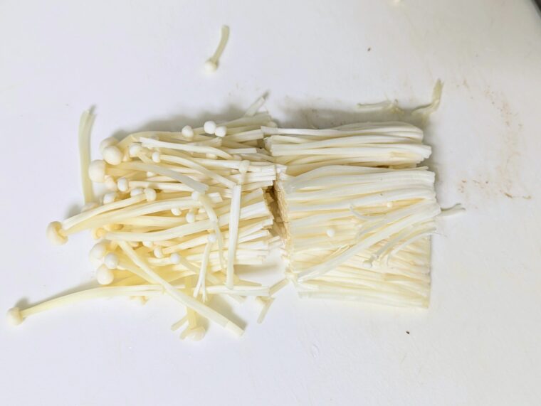②えのきも同様に石づきを切り落として真ん中で半分切ります。くっついている根本はほぐします。