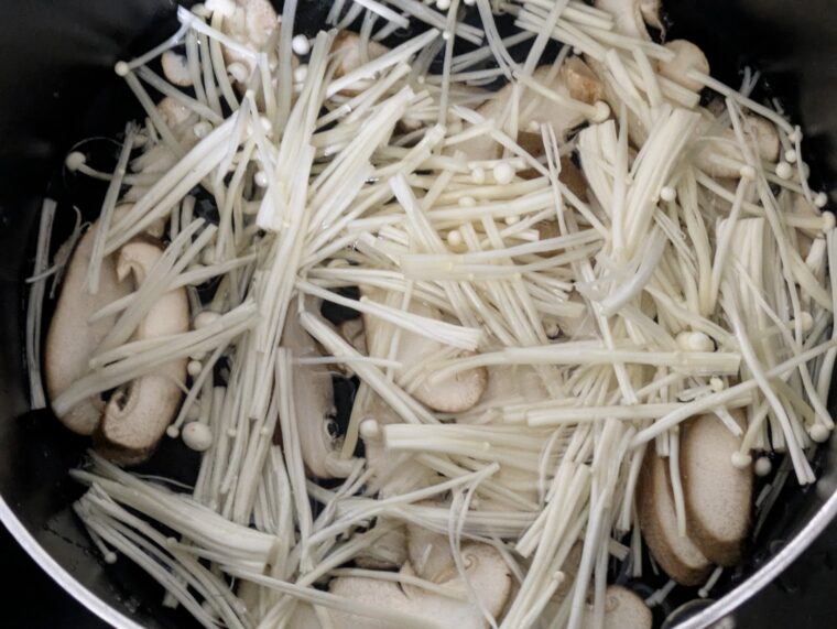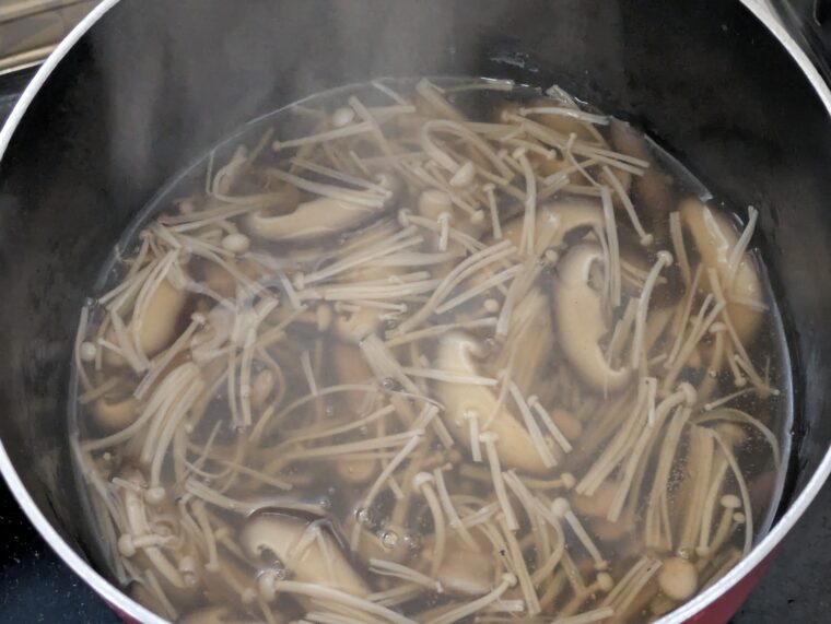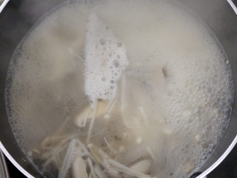 きのこは沸騰すると吹きこぼれる可能性があるので定期的にかき混ぜてください。