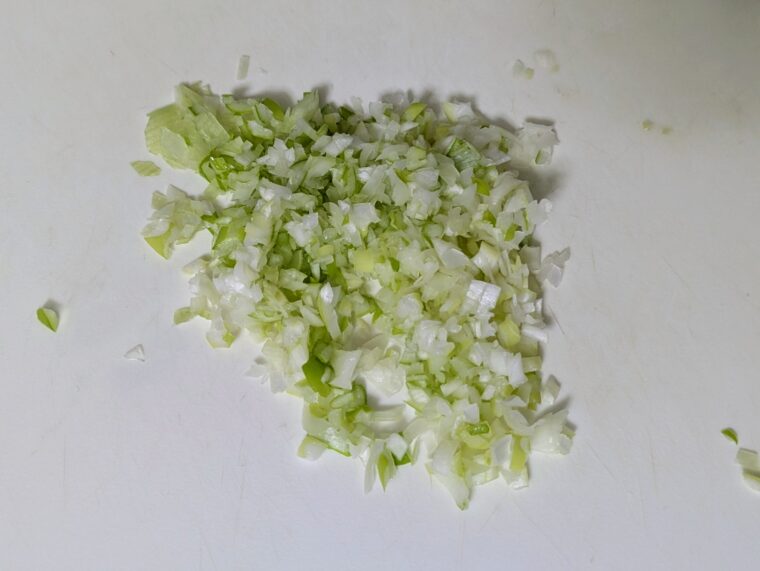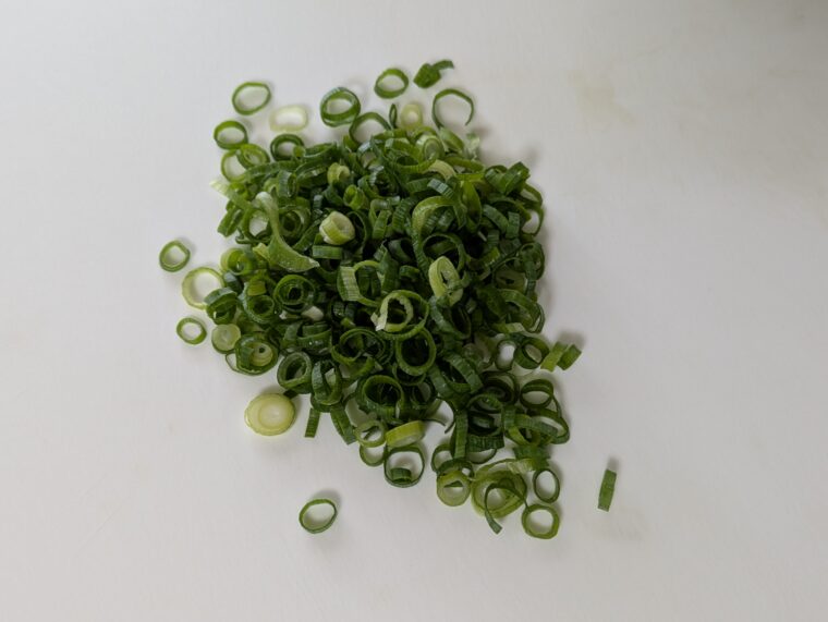 ⑨青ねぎは根を切り落としてから小口切りにします。