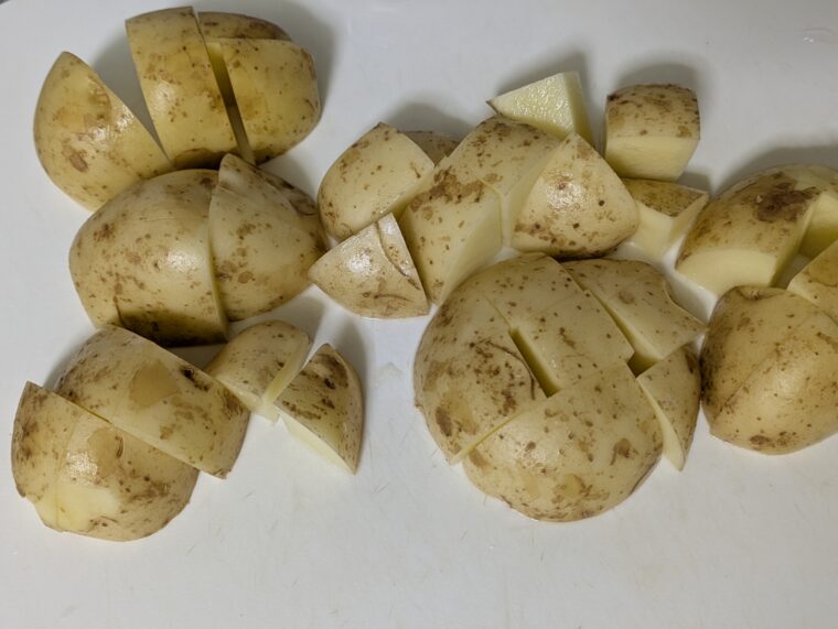 新じゃがなら皮ごと綺麗に洗ってからひと口大に切ります。