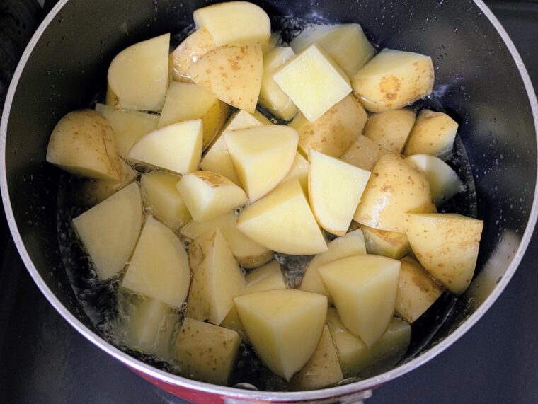 ①じゃが芋はピーラーで皮をむいて芽を取ってひと口大に切ります。