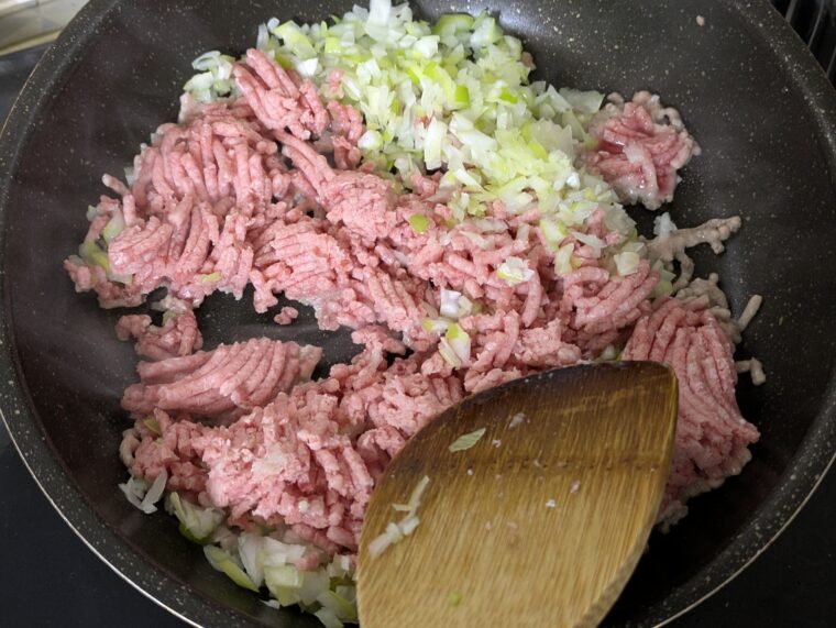 ⑥フライパンにサラダ油を引いてミンチと長ネギのみじん切りを中火で炒めます。