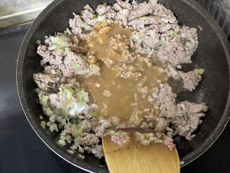⑦肉に火が通ってきたら⑤の調味料を入れとろっとするまで煮詰めたら火を止めます。