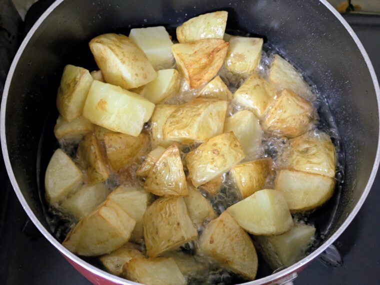 ③油が温まったらじゃが芋を入れて時々上下をひっくり返しながらじっくりと揚げていきます。