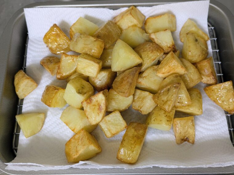 ⑧じゃが芋はこのくらいきつね色になったらバットに引き上げます。