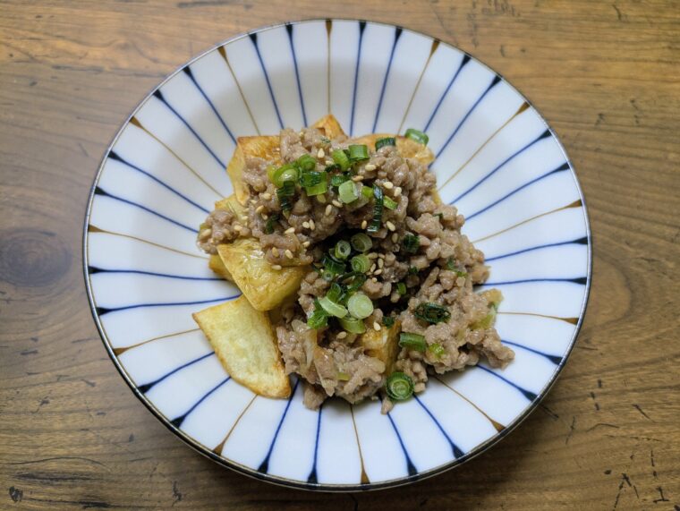 揚げたてのカリホクじゃが芋に濃いめの甘辛い肉味噌がよく絡んで最高です。ご飯とお酒どちらにもよく合います。是非新じゃがの季節にお試しください。
