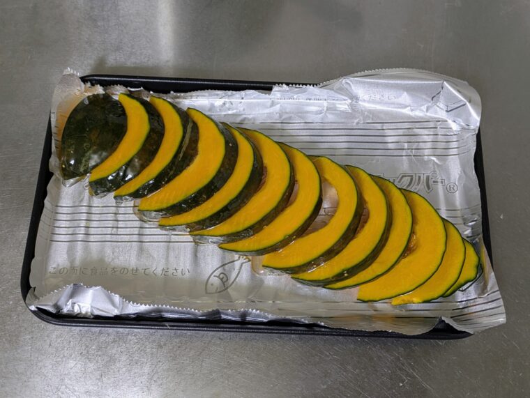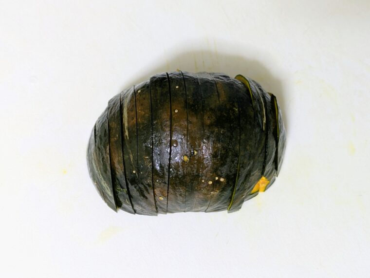 ①かぼちゃは種をくり抜いて3㎜幅の櫛切りにします。