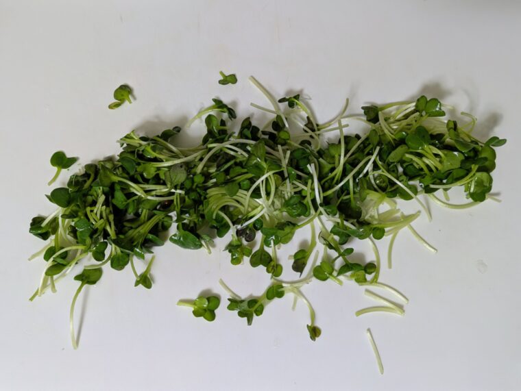 ⑥かいわれ大根は根を切り落としてひと口大に切ります。