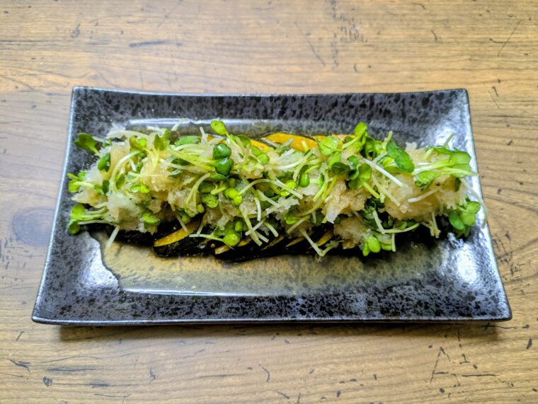 ⑨大根おろしをかぼちゃの上に盛り付けてポン酢をかけたら完成です。